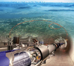 Das Labor, als Zentrum für friedliche Kernforschung nach dem Krieg gegründet, betreibt seit kurzem den stärksten Teilchen- beschleuniger der Welt, den „LHC“ (Large Hadron Collider). In vier Experimenten, die entlang des in ca. 100 m Tiefe angelegten kreisförmigen Tunnels (Länge 27 km !!!), supraleitende Magnet-Module mit einer Länge von je 15 m) installiert wurden, soll einerseits der Beweis für die Gültigkeit des Standardmodells zur Erklärung der Welt (durch Entdeckung des T eilchens „Higgs-Boson“, das der Überträger der Gravitationskraft sein soll), andererseits aber auch Forschung im Bereich Antimaterie, Urknall und Dunkle Materie im Universum betrieben werden.